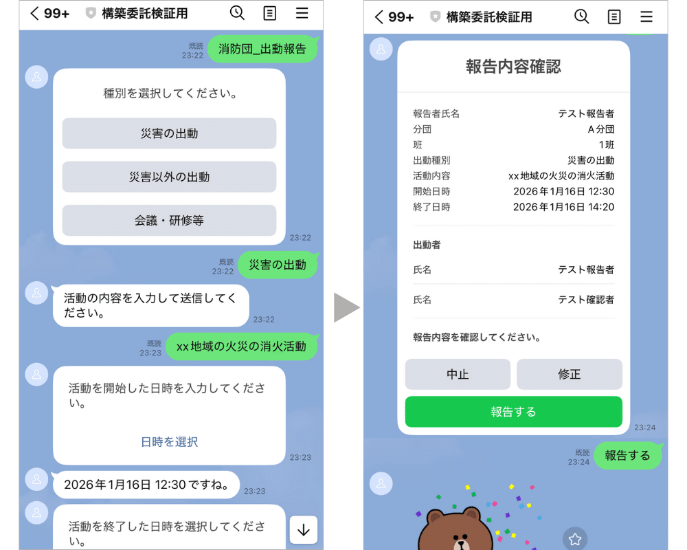 本機能では、出動報告をLINEで完結。さらに、団員の報酬額の自動計算、LINEからの履歴閲覧、自治体から団員へのメッセージ配信などにも対応しています。実際のLINEや管理の画面を交えながらご紹介します。